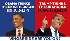 “Obama says to stay IN” while “Trump says to LEAVE the EU”. Interestingly, campaigners have not used Hilary Clinton as an “IN” advocate but have tricked Obama in as he is highly popular in Britain.